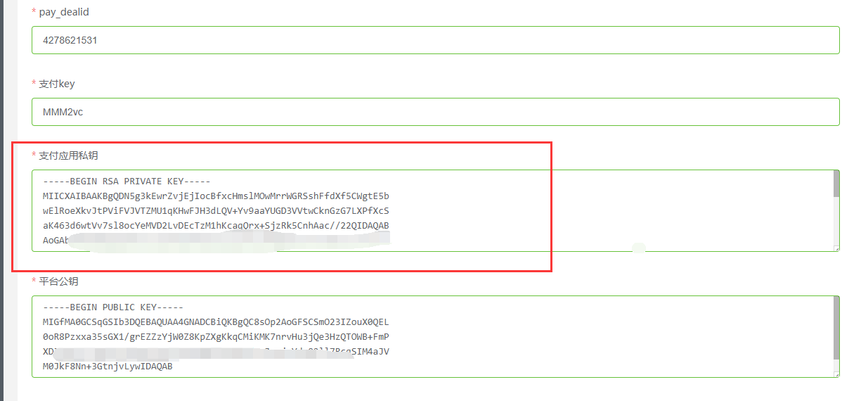 支付秘钥:生成秘钥 rsa_private_key.pem 里的,是私钥,填入这里
